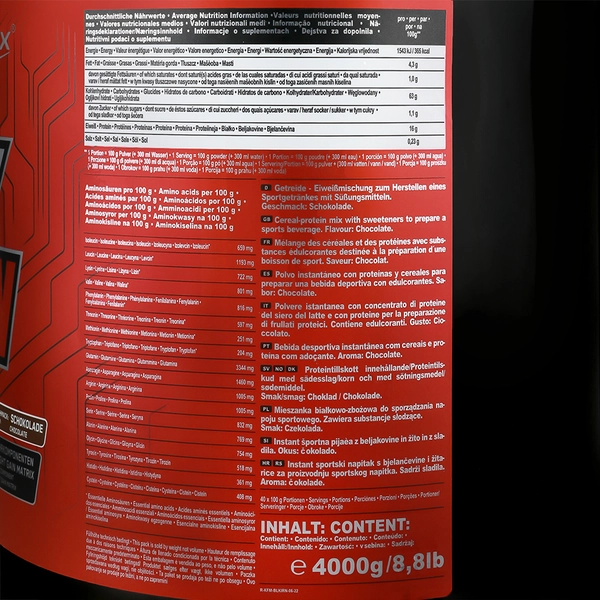 ایزی گین ایرون مکس به ازای هر 100 گرم حاوی 63 گرم کربوهیدرات، 16 گرم پروتئین و مجموعه ای کامل از اسید های آمینه شاخه دار (BCAA) و اسید های آمینه ضروری است.