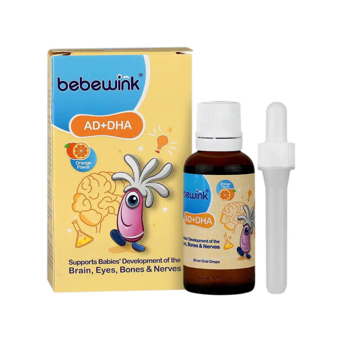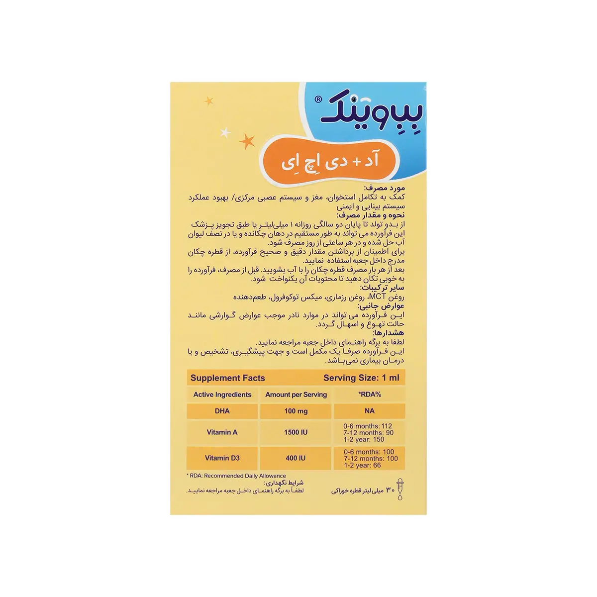 - قطره بب وینک آد دی اچ ای، فراهم کننده 1500 واحد ویتامین A و 400 واحد ویتامین D3 و 100 میلی گرم DHA به ازای هر میلیلیتر
