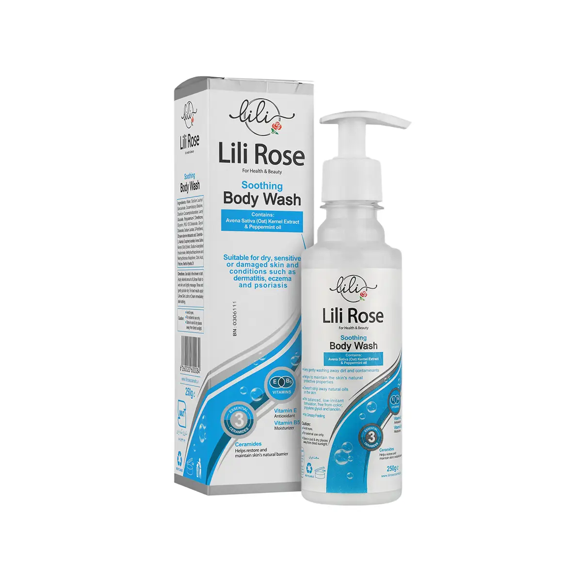 همچنین شامپو بدن مخصوص پوست خشک لی لی رز دارای سرامید-۳ برای بازسازی سد لیپیدی پوست و توکوفریل استات (ویتامین E) بهعنوان یک آنتیاکسیدان محافظ است. با pH سازگار با پوست، بافت سبک و غیر کومدوژنیک، منافذ را مسدود نمیکند و بدون باقی گذاشتن چربی، حس نرمی و لطافت ایجاد میکند.