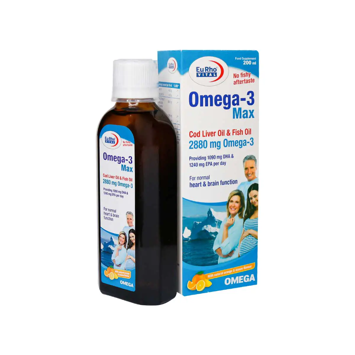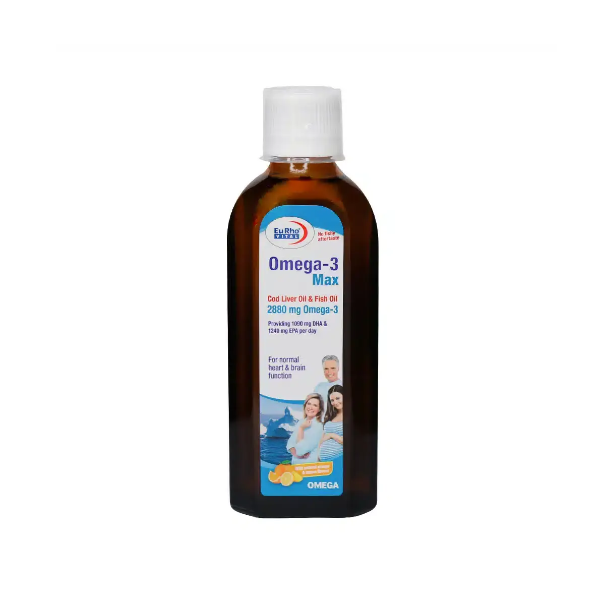 شربت امگا3 مکس یوروویتال یک مکمل تغذیه ای حاوی روغن ماهی و روغن کبد ماهی با خلوص بالا، به علاوه ویتامین های A، D و E است. امگا 3 مکس با تأمین دوز مناسبی از اسیدهای چرب ضروری DHA و EPA، به حفظ سلامت قلب و عروق، عملکرد طبیعی مغز و تقویت بینایی کمک می کند. ویتامین های محلول در چربی موجود در شربت امگا 3 یوروویتال، هم برای عملکرد نرمال سیستم ایمنی و مبارزه با استرس اکسیداتیو مفید هستند و هم موجب اثربخشی بهتر اسیدهای چرب امگا3 موجود در این مکمل می گردند. شربت امگا3 مکس برای استفاده در کودکان، بزرگسالان و سالمندان مناسب است.