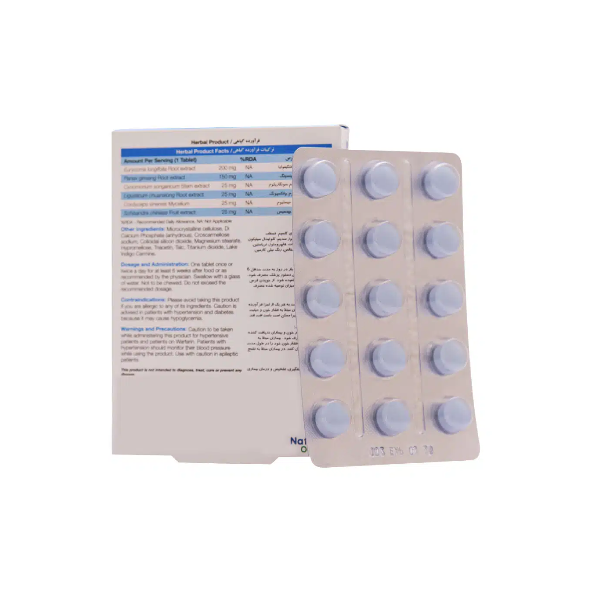 - قرص بلو پیل، حاوی ترکیبات گیاهی غنی شده با اوریکوما و جینسینگ