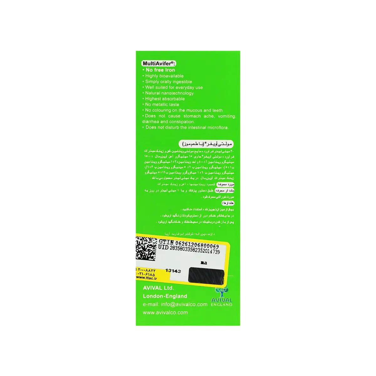 - قطره مولتی آویفر، فاقد گلوتن و شکر، با طعم دلپذیر موزی