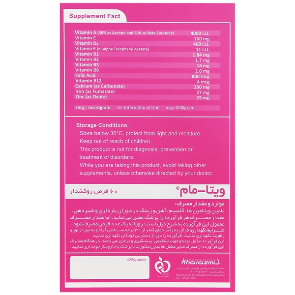مکمل ویتا مام در شرکت داروسازی خوارزمی ایران ساخته شده است. این محصول حاوی 60 عدد قرص در بسته بندی به فرم قوطی می باشد.