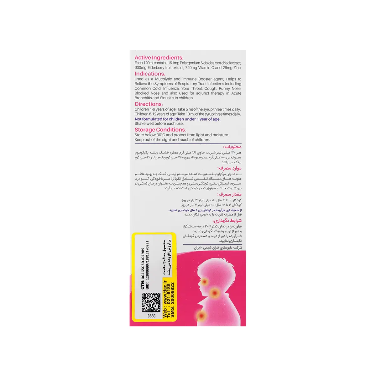 عصاره پلارگونیوم سیدوایدس موجود در این شربت به دلیل خواص ضد التهابی و ضد ویروسی خود، به کاهش علائمی مانند گلودرد، سرفه و گرفتگی بینی کمک میکند. همچنین، عصاره میوه الدربری با اثرات تقویتکنندگی سیستم ایمنی و فعالیت ضد ویروسی، بهبود علائم ناشی از آنفولانزا و سرماخوردگی را تسریع میبخشد.