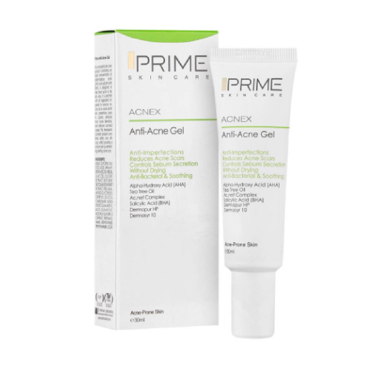 – آلفا هیدروکسی اسید (AHA): ترکیب دیگر ژل پوست آکنه دار پریم، آلفاهیدروکسی اسید است که دارای خواص لایه برداری ملایم، ضد التهابی و آنتی اکسیدان و شفاف کننده است و در رفع لک و اسکار بجای مانده بر روی پوست موثر است.