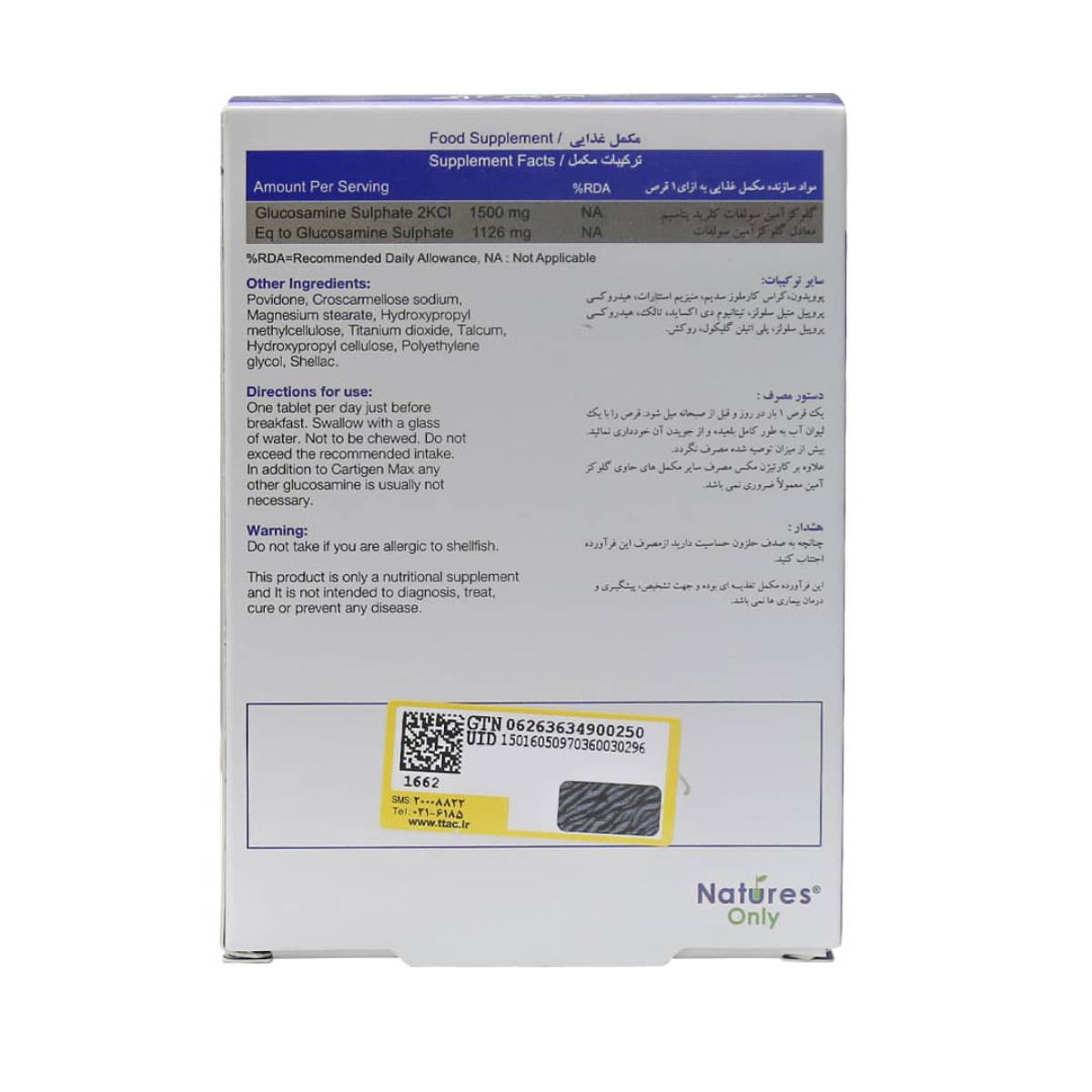 هر قرص کارتیژن مکس نیچرز انلی حاوی 1500 میلی گرم گلوکزآمین سولفات کلرید پتاسیم است که 1126 میلی گرم آن گلوکزآمین سولفات خالص می باشد.