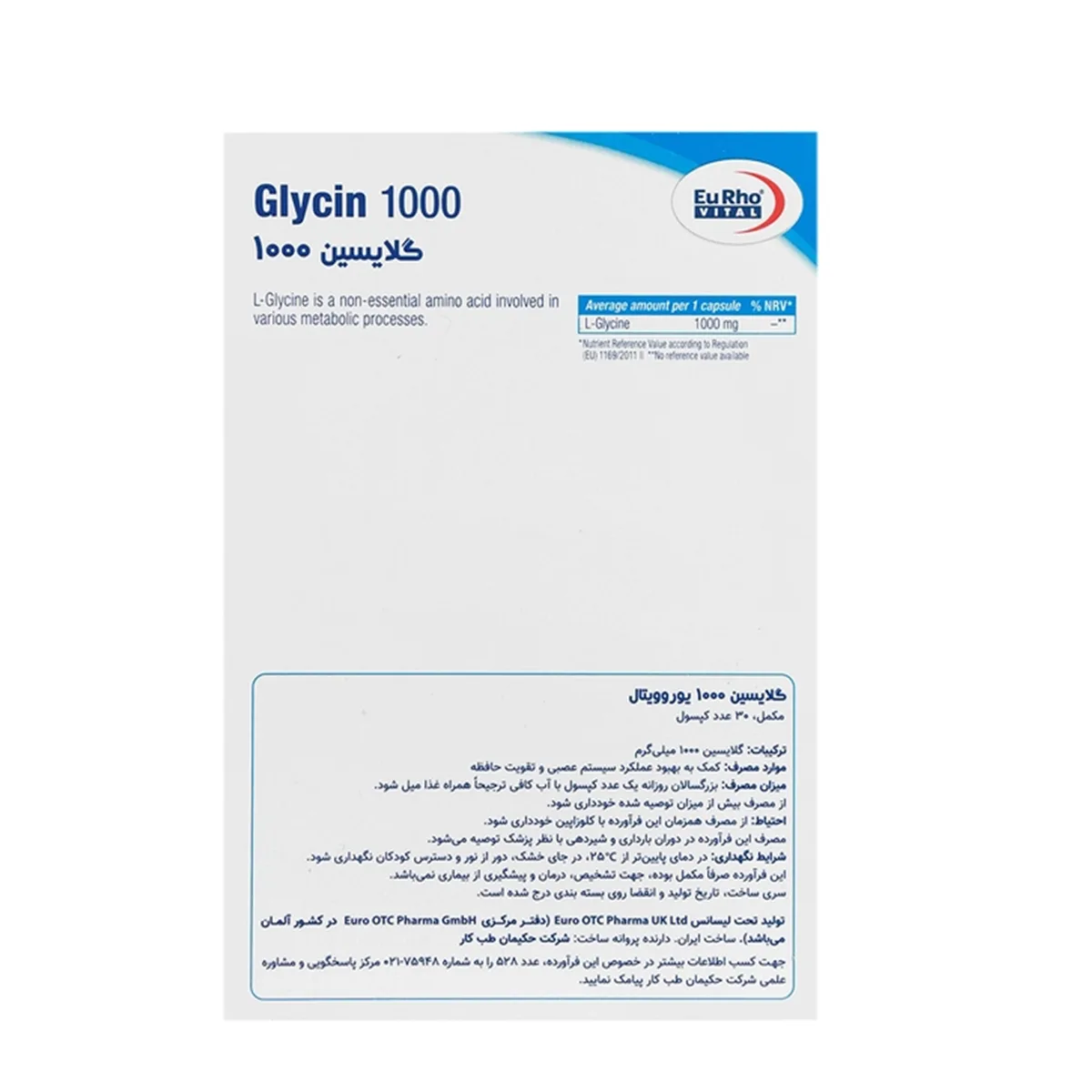 گلایسین یوروویتال مکمل تغذیهای حاوی 1000 میلیگرم اسید آمینه گلایسین به ازای هر کپسول است که به حفظ سلامت سیستم عصبی، بهبود آرامش ذهنی، کاهش استرس و اضطراب، افزایش کیفیت خواب، بهبود عملکرد شناختی، تقویت حافظه، تولید پروتئینهای کلاژن و کراتین، تولید آنتیاکسیدانها، تقویت ساختار پوست، عضلهسازی، بهبود حساسیت به انسولین و محافظت از کبد و قلب کمک میکند. گلایسین یوروویتال بهشکل کپسول در جعبه مقوایی 30 عددی تحت لیسانس Euro OTC Pharma GmbH کشور آلمان تولید میشود. شرکت حکیمان طب کار دارنده پروانه ساخت کپسول گلایسین یوروویتال در ایران است.